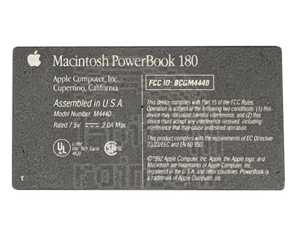Original Apple PowerBook 180 plastic bottom case model sticker. The original adhesive may not be sufficient to hold this in place and it may need additional adhesive.