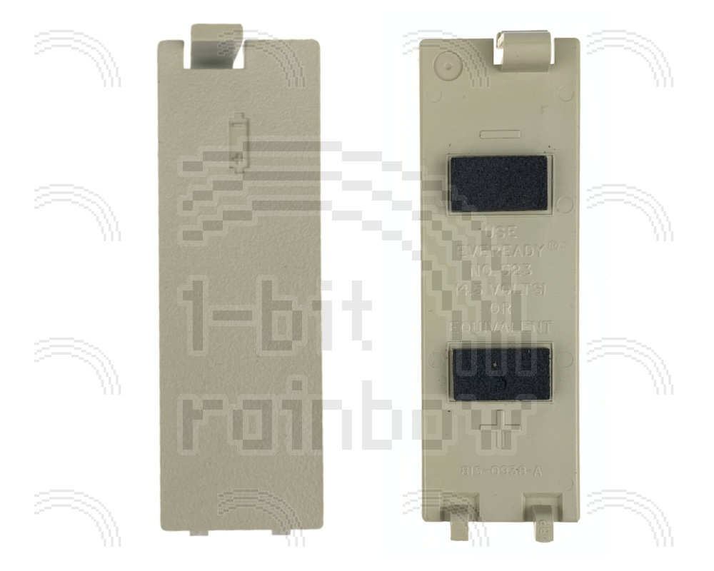 Original Apple battery door/cover for the original Macintosh 128K, 512K and beige version of the Macintosh Plus. There are various interchangeable versions of the battery door including two different battery icons on the front, some with 2 pieces of foam inside and one without. This variant has the smaller battery icon and has the foam pads on the back. Some bear the same part number as the v1 and v2 doors, and some have a later part number.