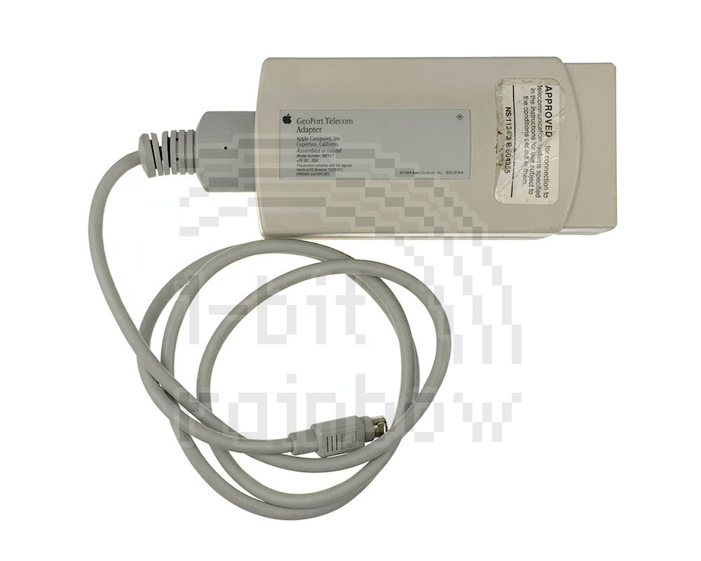 Original Apple GeoPort Telecoms adapter designed to be used with Macintosh models featuring a GeoPort. These machines used internal digital signal processors (DPSs) for audio visual processing and the idea of the geoport was to make the processing power of the DSPs available to external peripherlal. In reality, the only purpose this was ever put to was with the GeoPort Telecoms adapter which functioned as a modem but used the Macintosh' internal DSPs. The device has a standard rj11 telephone jack socket and is powered through the GeoPort.