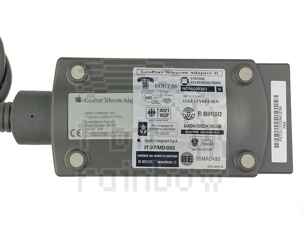 Original Apple GeoPort Telecoms adapter designed to be used with Macintosh models featuring a GeoPort. Although this is functionally interchangeable with the platinum version, this grey model was intended for use with the PowerBooks or Twentieth Anniversary Macintosh (TAM). Geoport equipped machines used internal digital signal processors (DPSs) for audio visual processing and the idea of the geoport was to make the processing power of the DSPs available to external peripherlal. In reality, the only purpose this was ever put to was with the GeoPort Telecoms adapter which functioned as a modem but used the Macintosh' internal DSPs. The device has a standard rj11 telephone jack socket and is powered through the GeoPort.