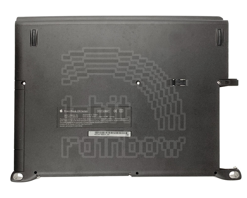 Original Apple bottom case for the PowerBook 190 series. Includes the reset button actuator, PCMCIA doors, rubber O-ring & eject buttons, and the media bay eject mechanism. Does not include the media bay LED. This is physically interchangeable with the 5300 series bottom case but has a range specific label.