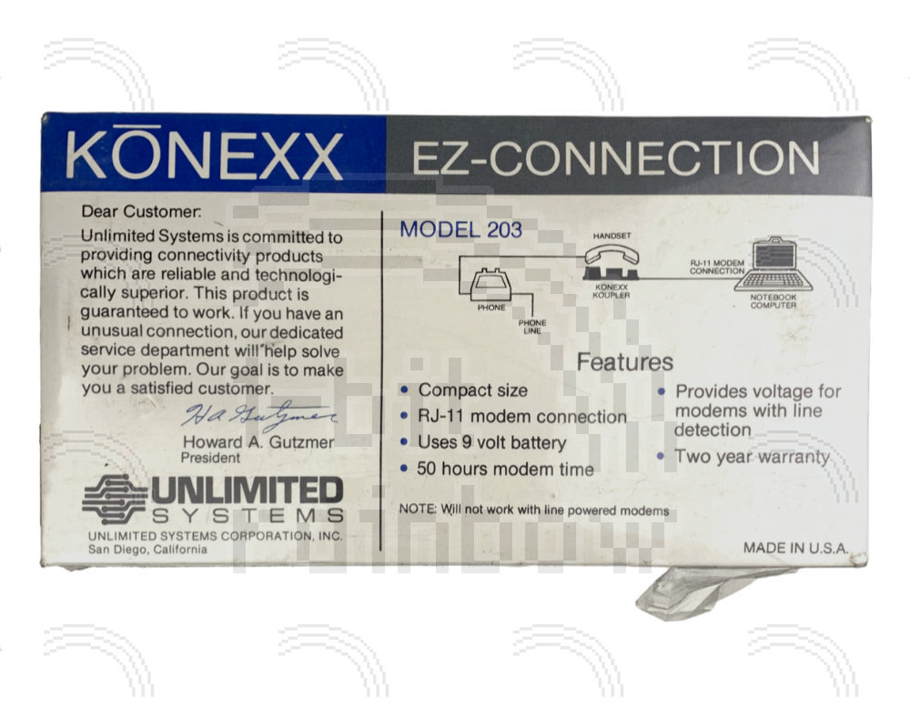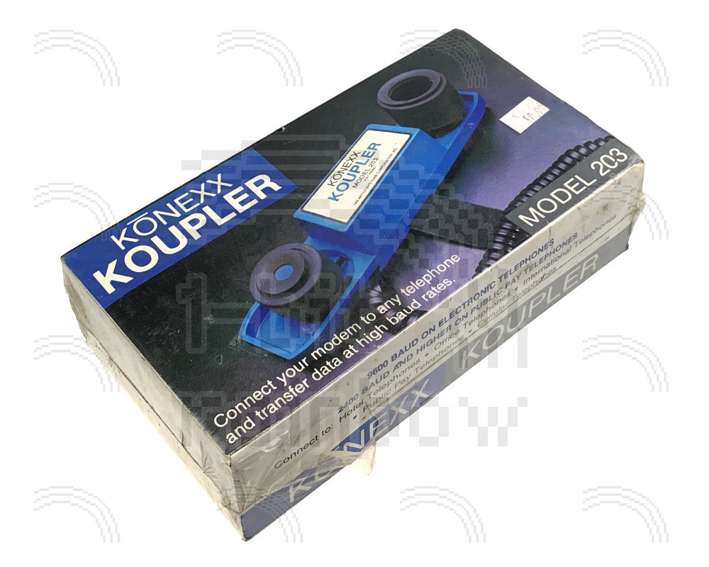 New, sealed Konexx Koupler Model 203 modem to telephone handset coupler. A rare piece of history from the early days of computer communications. It allows any modem to communicate audibly through any telephone handset if a phone jack was not available such as a pay phone or hotel phone. It is quoted as supporting speeds of 9600 baud over electronic telephones and 2400 baud on public phones pay phones.