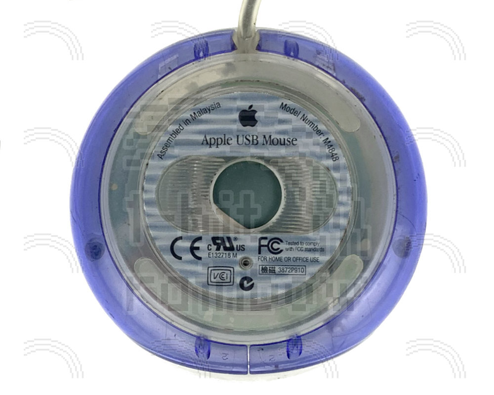 Original Apple, fully tested and deep cleaned, Grape (purple) 'hockey puck' USB mouse that shipped with the grape iMac G3 models. This is the second revision that has an indentation in the button to help overcome the problem of the mouse rotating during use. It has a 60cm cable and one button, although it will function on any computer with USB.